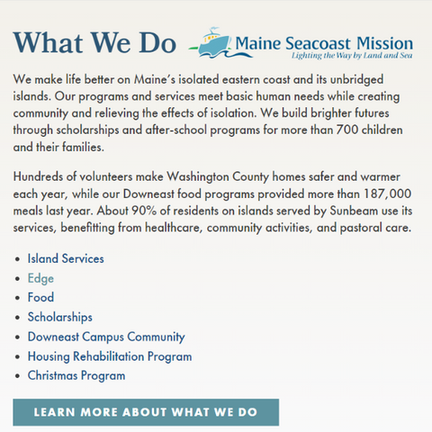 Finally, the Maine Seacoast Mission provides compassionate services that help promote the well-being of children, families, individuals, and communities within Maine’s unbridged islands and coastal Downeast region. Since its founding in 1905, its work has been rooted in trust and respect for those they serve and a commitment to working with people’s strengths. They offer youth programs, island services, telemedicine, housing rehabilitation, food assistance, and college scholarships, and work to eliminate any barriers to participation that might exist. From transportation for after school programs and a mobile food pantry for homebound individuals, to outreach and health services for residents of Maine’s most remote coastal and outer-island communities, Maine Seacoast Mission provides vital resources, opportunity, and a sense of belonging. In addition to distributing gifts to children, families, and the elderly during the holidays, the Mission also accepts contributions through their Mission Fund to help with ongoing operating support for all of their programs. Learn more and donate here.